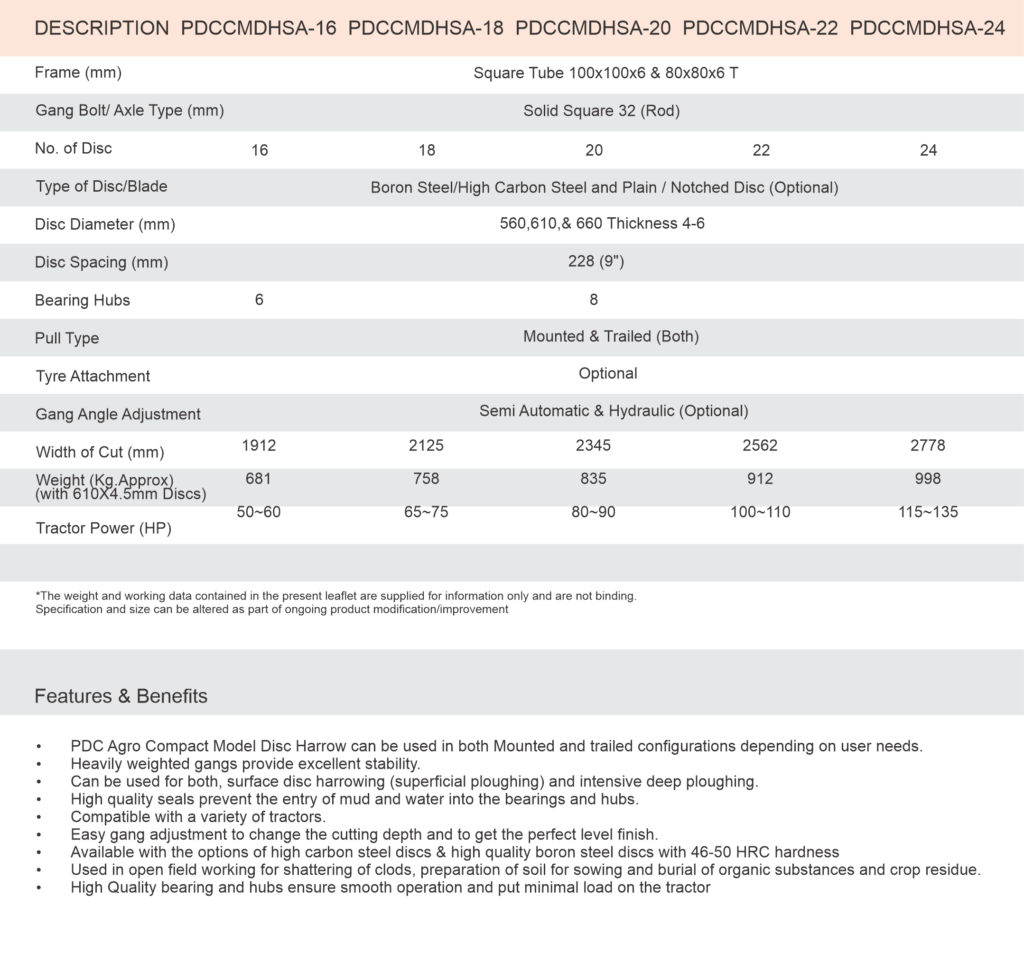 The compact model disc harrow is a space-efficient agricultural implement designed for soil cultivation. Its smaller size offers versatility and maneuverability, making it ideal for smaller fields while maintaining effectiveness in breaking soil, preparing seedbeds, and contributing to overall agricultural efficiency.