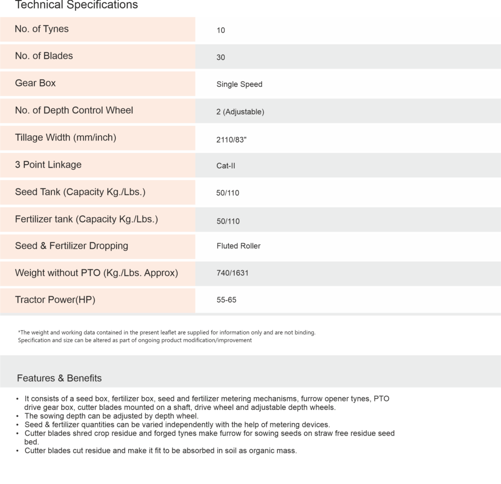 • It consists of a seed box, fertilizer box, seed and fertilizer metering mechanisms, furrow opener tynes, PTO drive gear box, cutter blades mounted on a shaft, drive wheel and adjustable depth wheels.