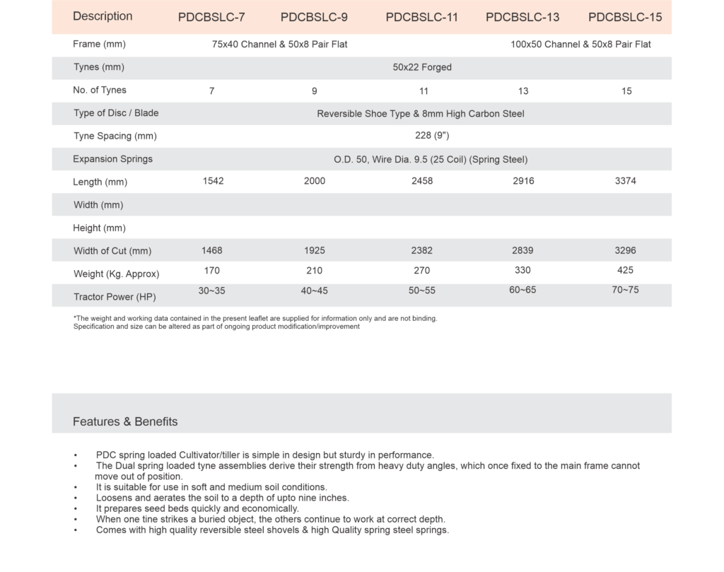 The PDC Spring Loaded Cultivator is an agricultural implement designed for efficient soil cultivation. Utilizing a spring-loaded mechanism, it ensures effective ground penetration, making it a reliable tool for preparing seedbeds and enhancing overall agricultural productivity.